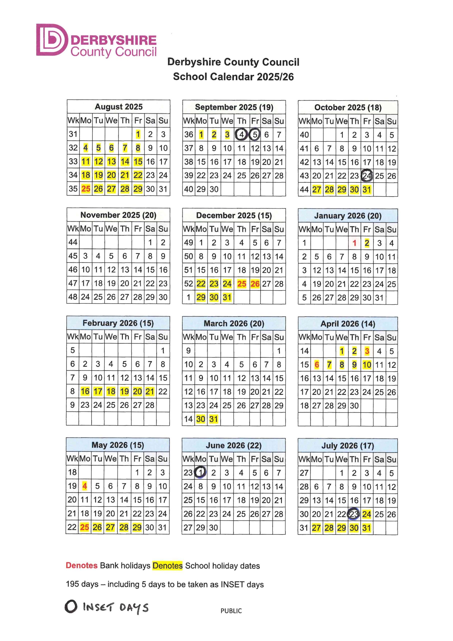 Please click on the link below for a full calendar of this years agreed Term Dates and Inset Days. Term Dates – Autumn 2025 – Summer 2026 Term Dates – Autumn 2024 – Summer 2025 Term Dates – Autumn 2023 – Summer 2024 Term Dates – Autumn 2022 – Summer 2023